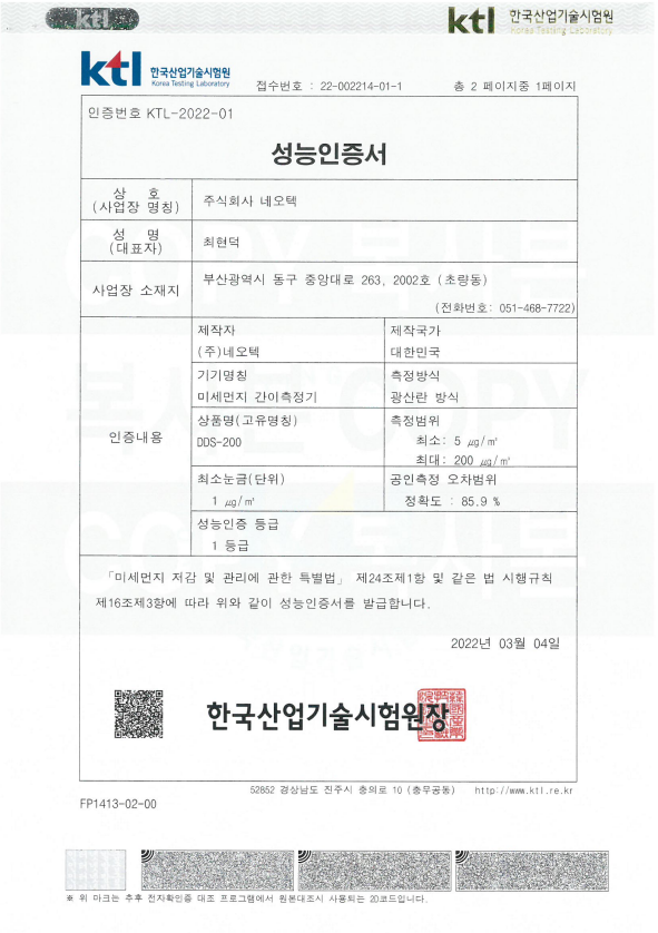 | 측정방식 | 광산란방식 | 인증현황 | 미세먼지 성능 1등급, KC인증 |
